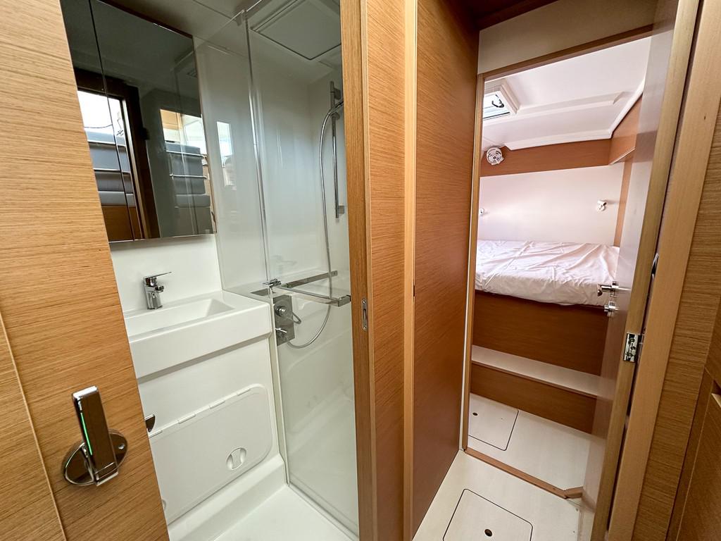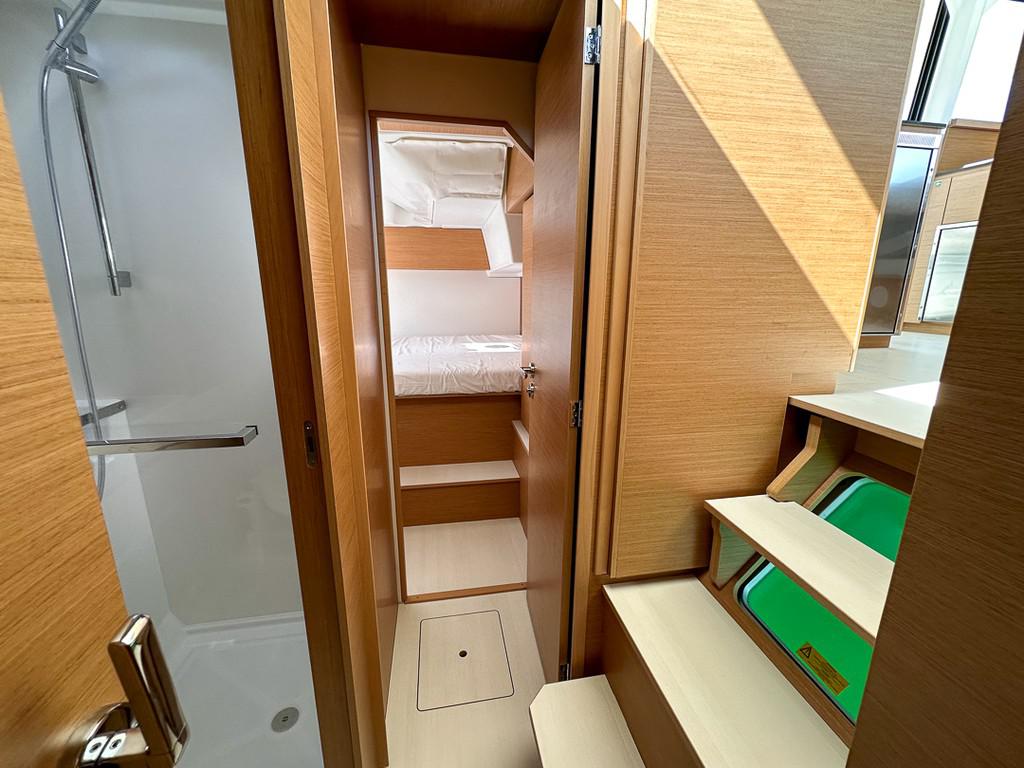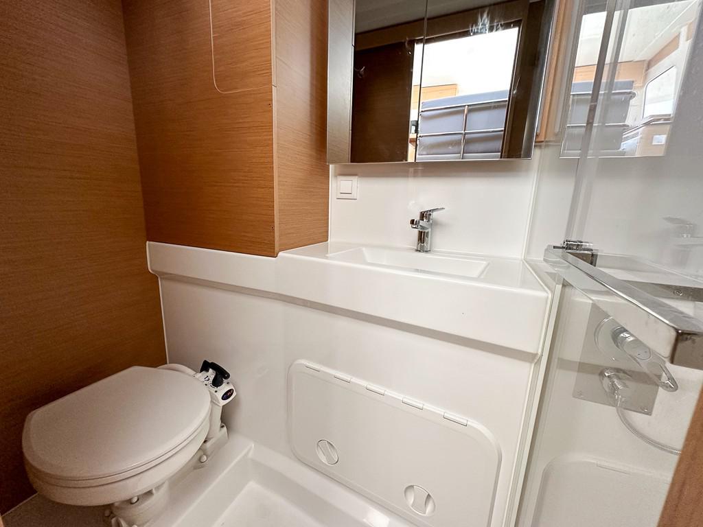 elektrische Ankerwinde, Außendusche, Roll-Genua, Bimini, Bilgenpum, Anker, Kaffeemaschine, Gangway, Elektrische Bilgepumpe, Abwassertank, Gasflasche, Außenlautsprecher, Dusche an Deck, 12-Volt-Stecker, 220-Volt-Stecker, Notpinne, Erste-Hilfe-Set Rettungsinsel, USB-Anschluss, AIS, elektrische Toilette